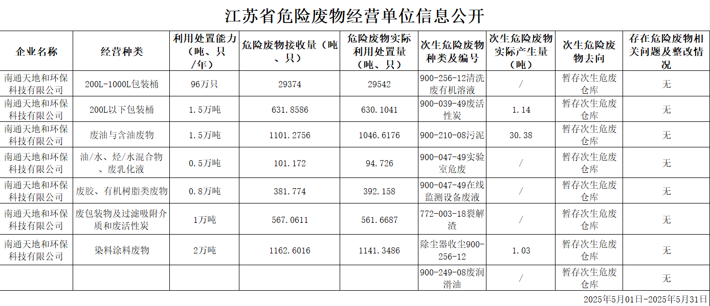 (2025年5月信息)江苏省危险废物经营单位信息公开