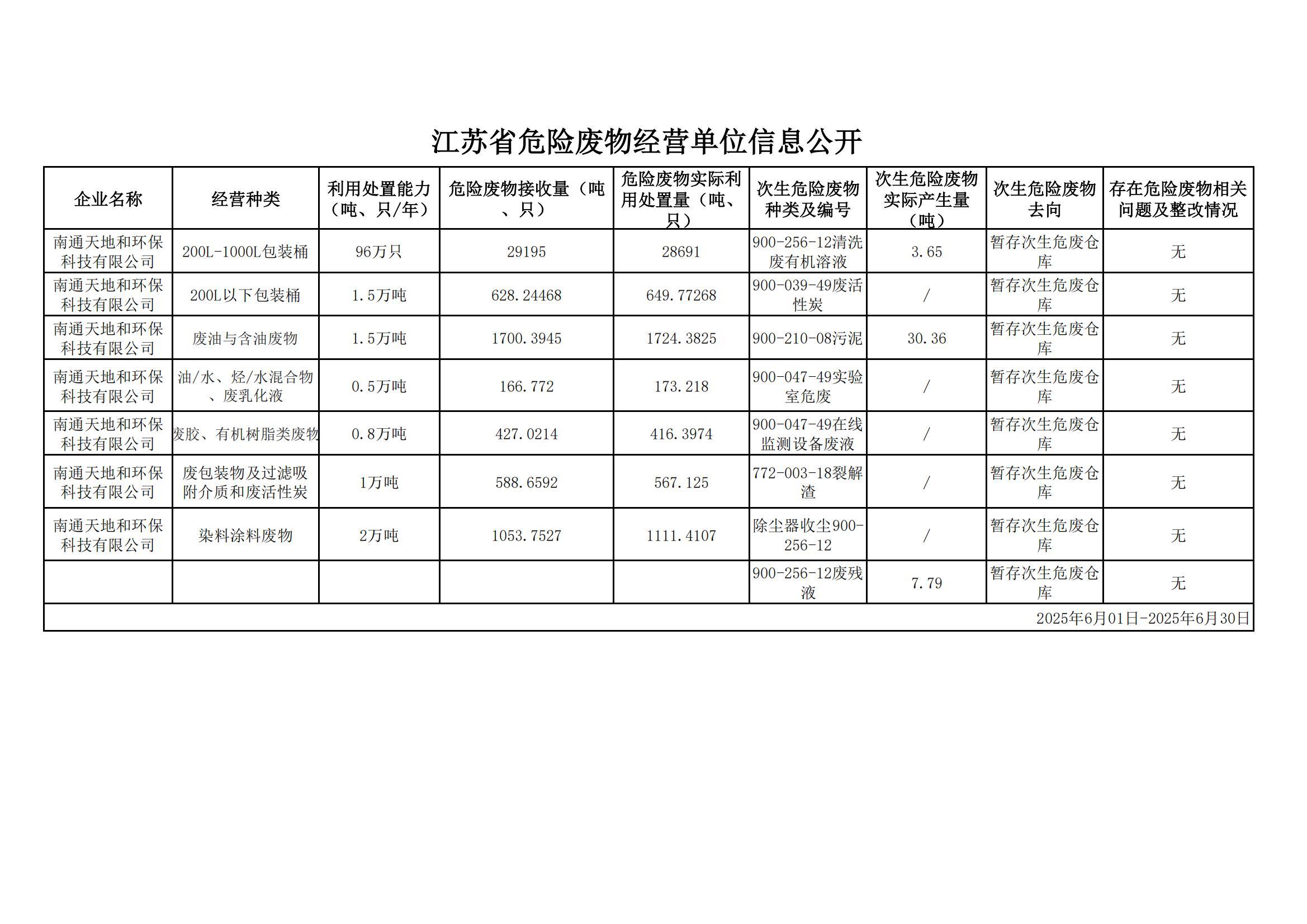 (2025年6月信息)江苏省危险废物经营单位信息公开