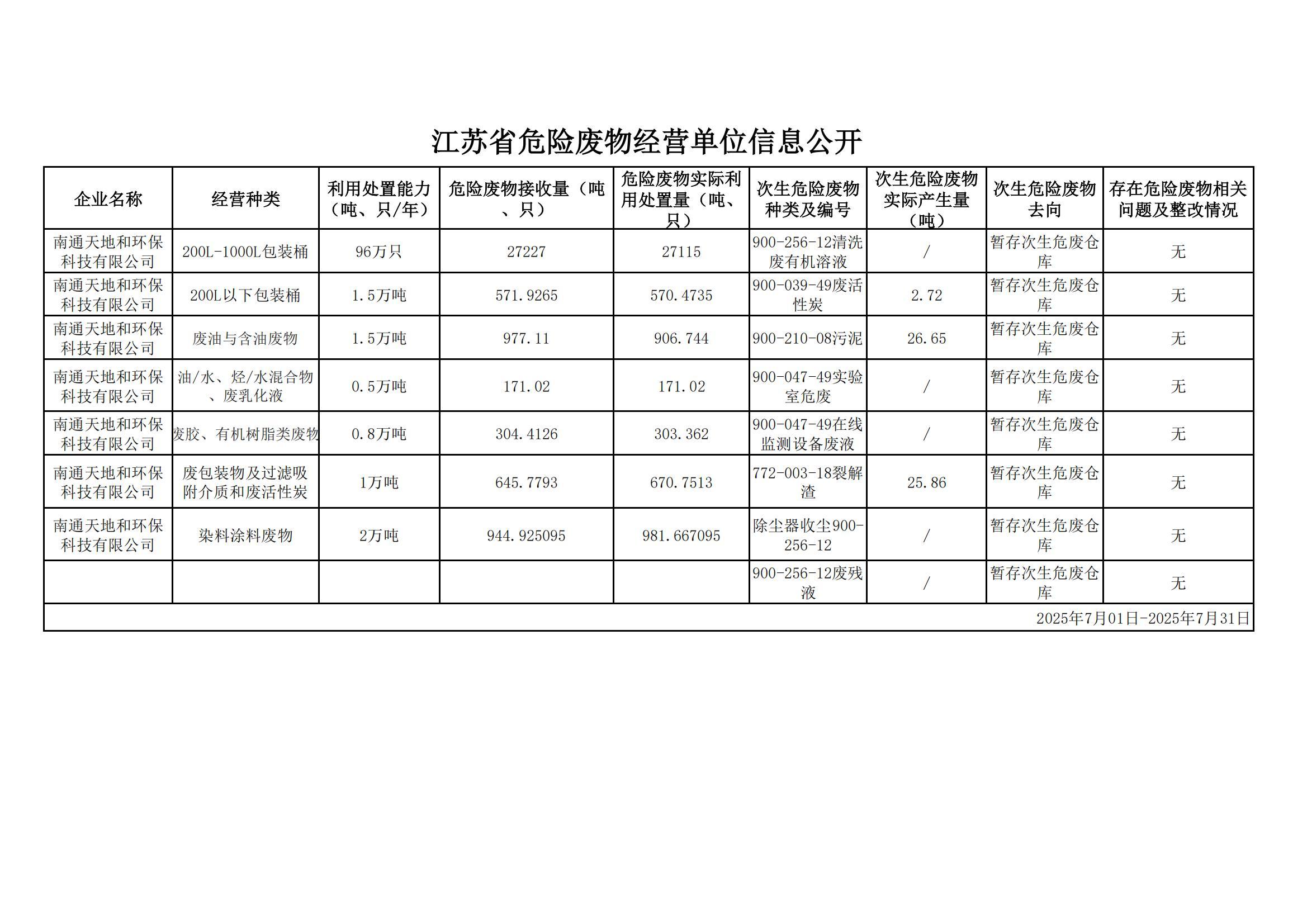 (2025年7月信息)江苏省危险废物经营单位信息公开